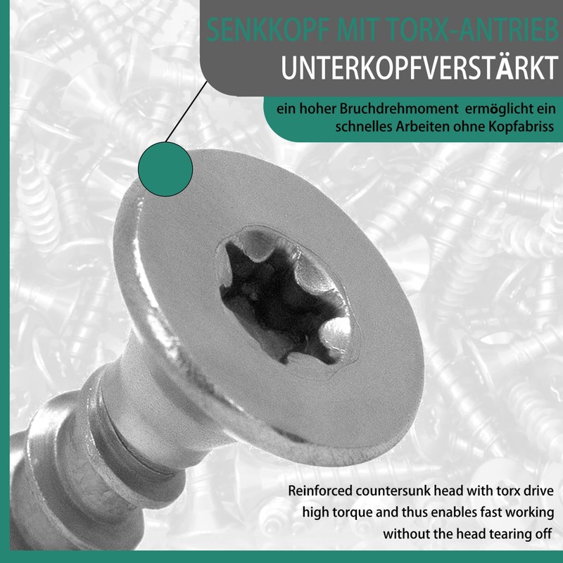 - Chipboard screw with reinforced head and Torx drive made of A2 stainless steel. The countersunk head allows flush countersinking of the screw into the material