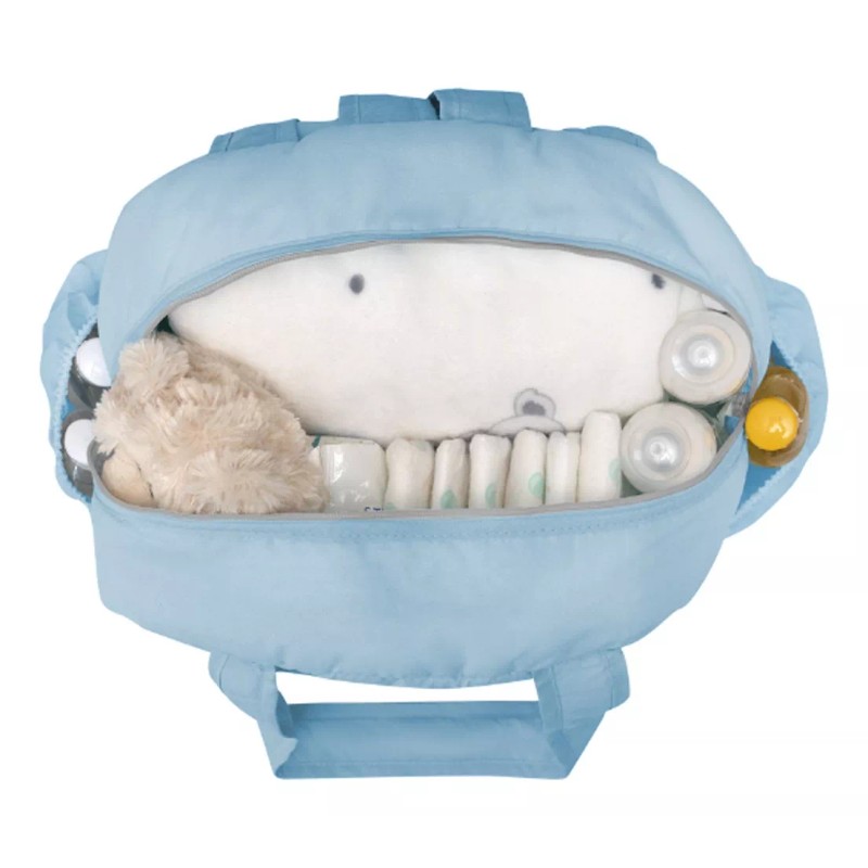 Exterior con dos grandes compartimentos frontales y dos bolsillos laterales ideal para biberones y termos. Interior con tres bolsillos y un elástico para biberones, para una organización óptima.