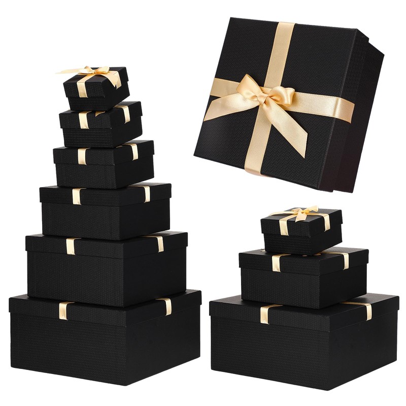 Chivertion 6 Pack Large Nesting Gift Boxes with Lid Ribbon 6 Size Square Gift Wrapping Stacking Boxes for First Day of School Birthday Wedding Bridal Baby Shower Party Decorative(Black)