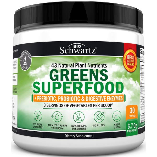 - 3 servings of chlorophyll rich green veggies in every scoop: BioSchwartz greens superfood is loaded with a blend of organic whole foods including super fruits, vegetables, grasses, and marine greens. Every scoop contains 3 full servings of nutrient-rich veggies that promote whole body health, intestinal support, and increased energy levels