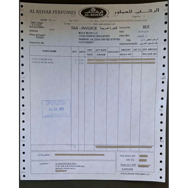 Indulge in the sweet and sensual aroma of Choco Musk by Al-Rehab, a rich blend of warm chocolate, creamy vanilla, and soft musk. This 50ml Eau de Parfum is a customer favorite for its long-lasting scent and gourmand appeal, making it perfect for both men and women.