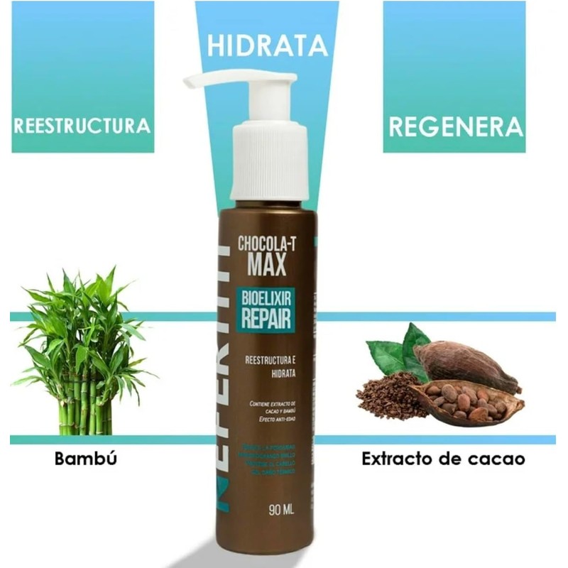 CHOCOLA-T MAX BioElixir Repair ofrece reparación intensiva y hidratación profunda para cabello seco y dañado. Su fórmula avanzada nutre el cuero cabelludo y protege contra daños ambientales, reduciendo el frizz y mejorando la manejabilidad. Libre de residuos y protector de calor, ideal para resultados profesionales en casa.