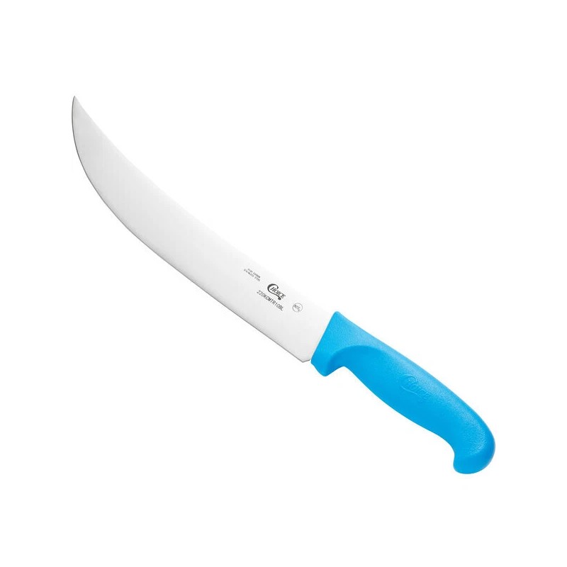 Cut and trim a variety of meats with this Choice 10" blue cimeter knife.Featuring a sleek, curved design, this knife allows you to slice steaks and other large chunks of meat with ease. The pointed tip helps make deep cuts and holes, so you can slice and cut meat in one fluid motion. Perfect for cutting and trimming meat in your restaurant kitchen, grocery store, or butcher shop, this knife provides users with smooth, clean cuts after each and every use.