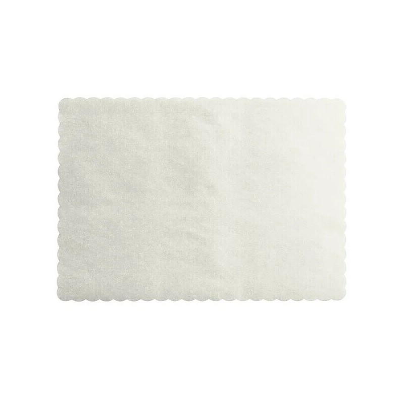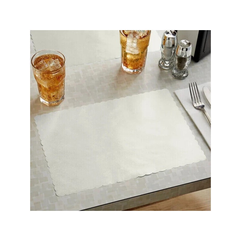 Elevate your dining experience with these 50 gray colored paper placemats. The scalloped edge adds a touch of elegance to any table setting, while the rectangular shape provides ample space for dishes and utensils. These placemats are perfect for any occasion, from formal dinners to casual gatherings, and their solid pattern complements any theme. Made of high-quality paper material, these placemats are both durable and disposable, making cleanup a breeze. Use them in your home or restaurant to create a stylish and functional dining space.