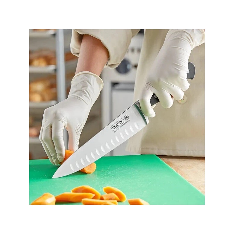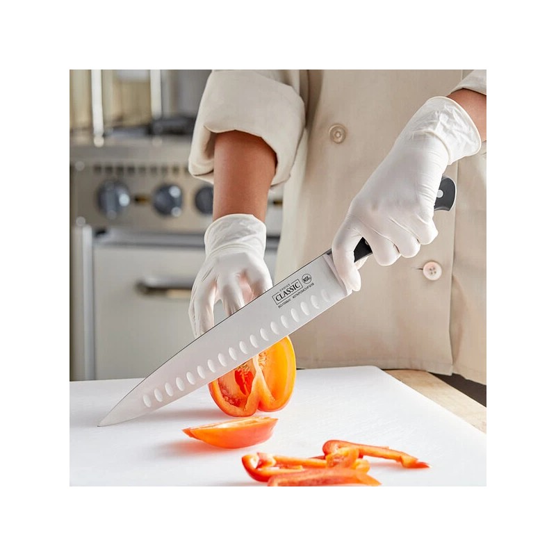 This essential kitchen tool features a granton blade edge that breaks suction between the knife and food, allowing for effortless, fluid slicing. Boasting a durable, fade-resistant, and colorfast polyoxymethylene (POM) handle, this knife is perfect for long-term, sustained daily use in any high-volume establishment, including restaurants, culinary schools, and commercial kitchens. Versatile, affordable, and high quality, this Choice Classic chef knife is the ideal tool for making effortless and efficient precision cuts.