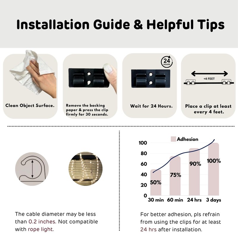 - Versatile Application: Our outdoor light clips feature a robust adhesive that firmly adheres to any dry, flat surfaces, including wood, metal, glass, fences, ceilings, solid walls, and tables. They are easily removable without leaving any residue or causing damage. NOTE: These cable holders are not suitable for uneven, damp, oily surfaces, wallpaper, or dusty walls.
