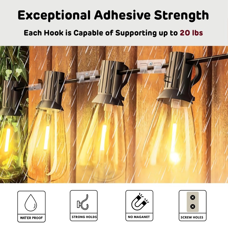 - Secure Cords Effortlessly with Two-hook Clips for Hanging: The conventional single hook design often proves unstable, swaying from side to side. In contrast, our refined and enhanced outdoor light hook design effectively prevents fixtures from sliding or sagging. You can easily adjust them to the optimal height, allowing you to revel in a stunning display.