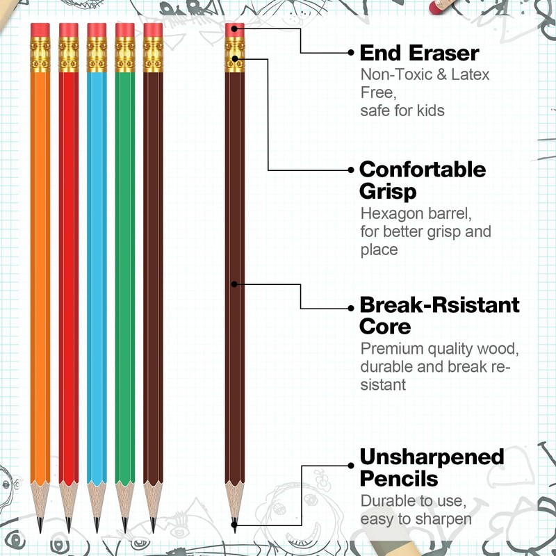 - Easy to Use: the hexagonal eraser head design of unsharpened pencils bulk for kids makes it easy to use for long writing periods, and the eraser allows for convenient corrections; With balanced performance, minimizing rolling and providing safe and reliable use