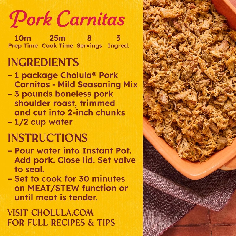- FOR ALL OCCASIONS: Every occasion is made more delicious with Cholula Pork Carnitas Mild Seasoning Mix.