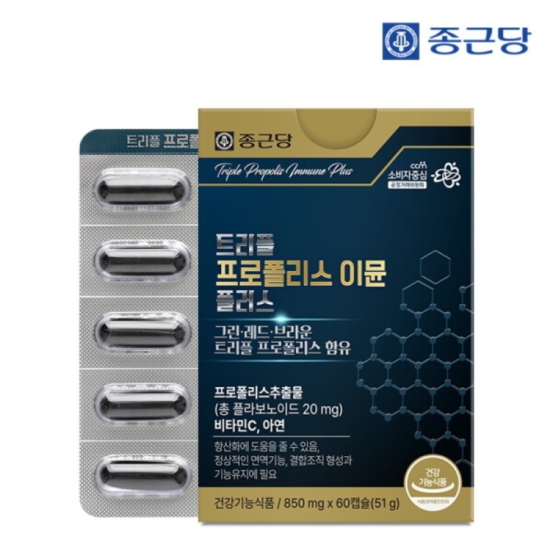 종근당 트리플 프로폴리스 이뮨 플러스 60캡슐 1박스 2개월분 브라운 레드 그린프로