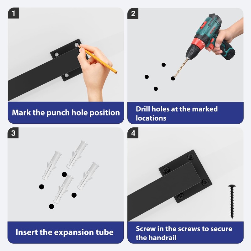 - Drywall Installation Note: When installing handrail on a drywall surface, you must locate the wall studs and secure the screws directly into the studs. Do not rely solely on wall anchors. If the stud positions do not align with the handrail's mounting points, install a horizontal wood batten that spans between the studs. Important: If screws are driven only into the drywall/hollow wall cavity using plastic anchors, the weight-bearing capacity will be highly inadequate for a secure attachment