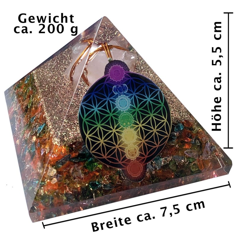 Contents and dimensions: width approx. 7.5 cm Flower of Life orgone pyramid or EMF radiation protection pyramid and approx. 5.5 cm height. Weight: approx. 200g