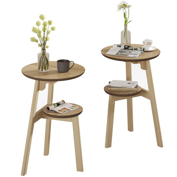 ChooChoo Round End Table Set of 2, Narrow Side Table for Small Spaces, Accent Table Night Stand with 2 Tier Shelf for Bedroom and Living Room, Natural