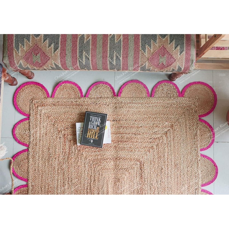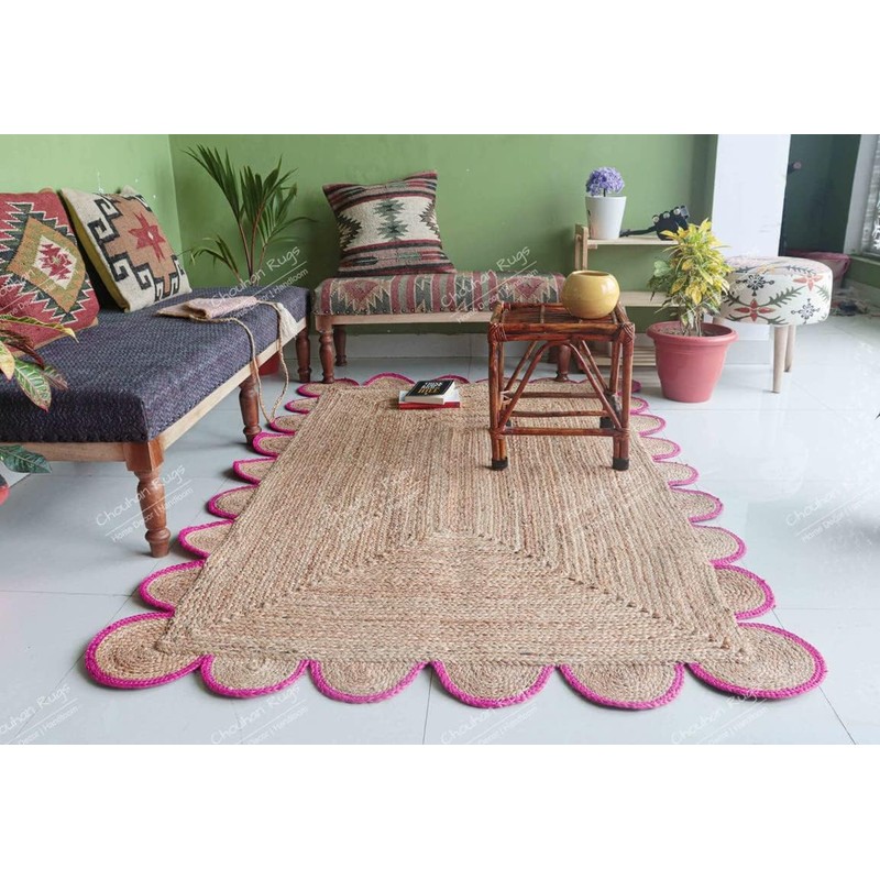 Chouhan Rugs Natural Jute Scalloped Area Rugs Handwoven Boho Indoor Farmhouse Braided Rug for Livingroom, Bedroom, Kitchen (Pink-N5, 2x6)