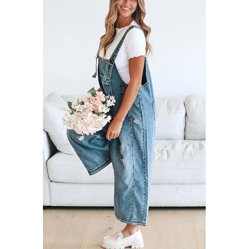 - Baggy denim overalls with bib pockets in front, featuring intentionally broken holes for a stylish look, comfy wide leg design, side button closure, about ankle length