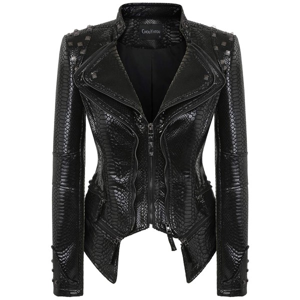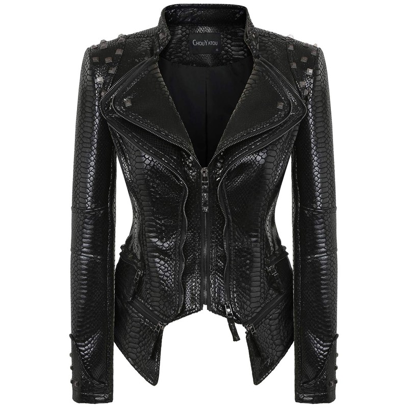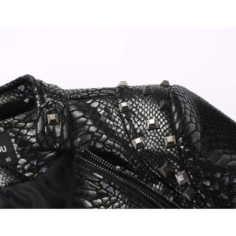 chouyatou Women's Fashion Snake Pattern Print Studded Moto Pu Leather Biker Jacket (XX-Large, Black)