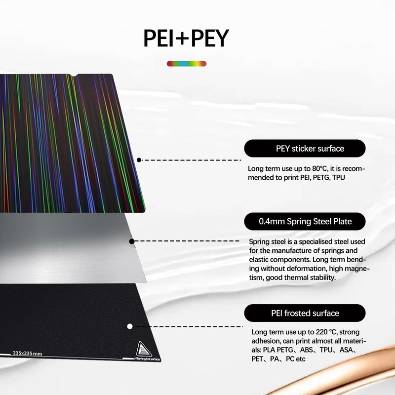 - 【PEI+PEY Double Sided Printing】Double-sided PEY+PEI spring steel plate , One side is a Light beam pattern film,can print PLA and TPU and PETG. The other side is black PEI textured surface,the unique frosted texture, with strong adhesion, can adapt to print most filaments like PLA/ABS/PETG/TPU/Nylon.