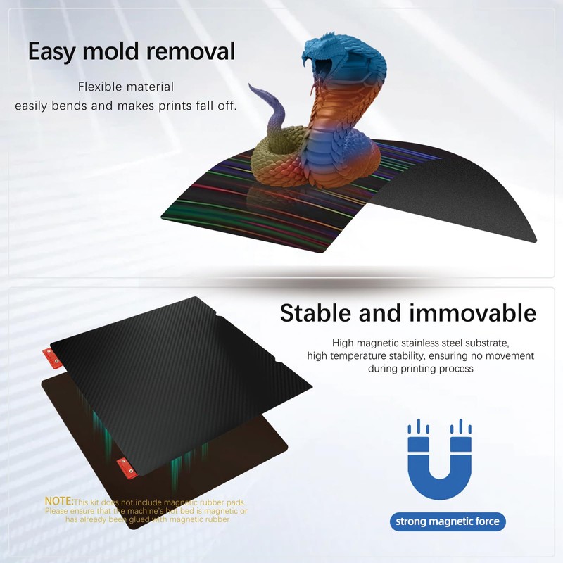 - 【Easy to use and Effortless Removal】Simply place the building surface on a magnetic heated bed for use, and it can be easily removed. The flexible stainless steel can be easily bent and the printed model can be easily removed.
