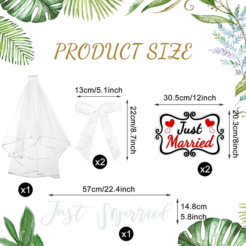 - Package Includes: You will receive 2 pieces of just married ornate car magnets decorations(approx. 12 x 7.5 inch), 2 piece of white rearview mirror bowknots(approx. 6.29 x 10.24 inch), 1 piece of just married car sticker(22.4 inch), 1 set of simple just married hanging banner(4.7 x 5.7 inch for 1 card), 1 piece of wedding veil(31.5 inch). This set of just married car decorations will make your honeymoon wedding car full of romantic and elegant atmosphere.