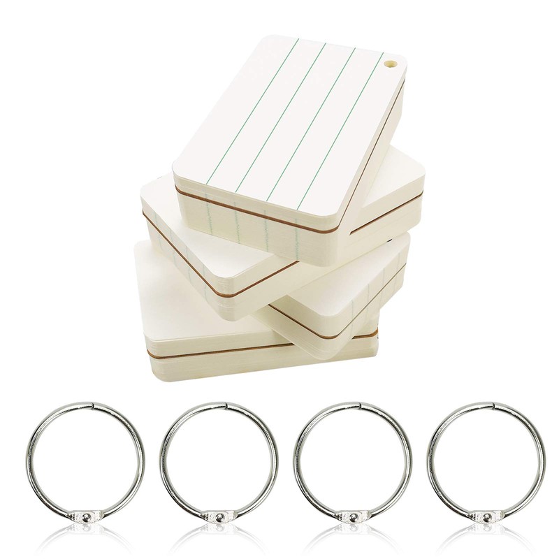 Chris-Wang 200 Sheets Hole Punched and Perfed Words Study Card Flash Cards with 4 Metal Binder Rings, Style A(4 Ruled Line Front, Blank Reverse)