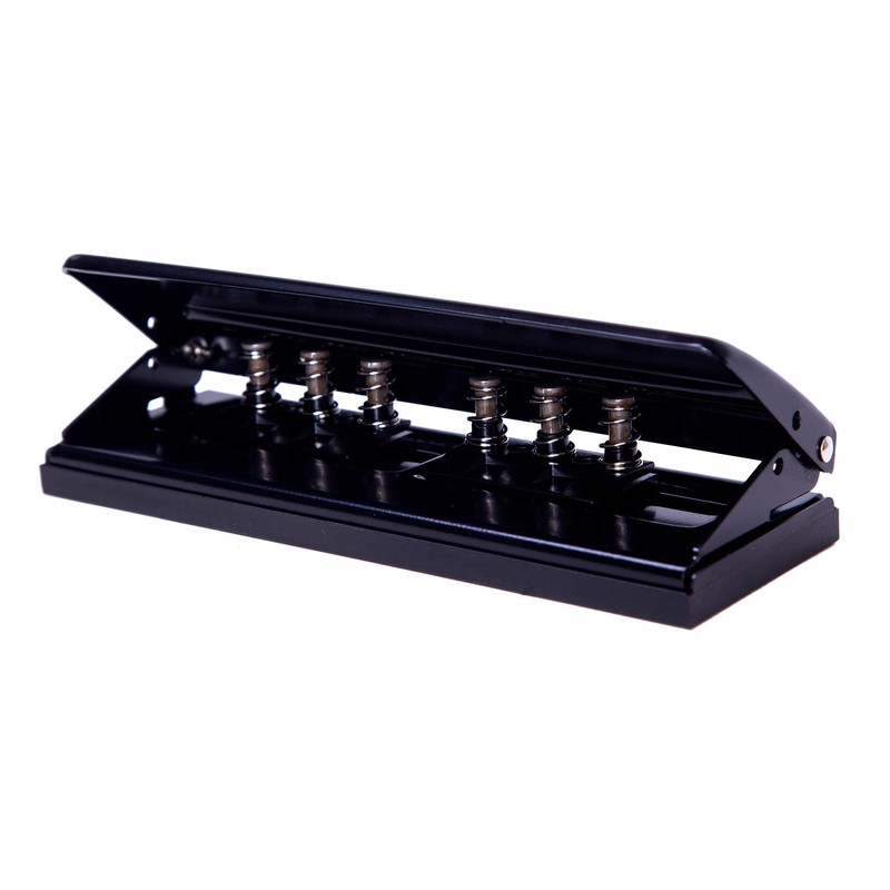 - Punches up to 6 sheets with 6mm diameter holes. Punched with 2 groups of 3 holes spaced 19mm; the distance between 2 groups is three position adjustable: 19mm, 51mm and 70mm
