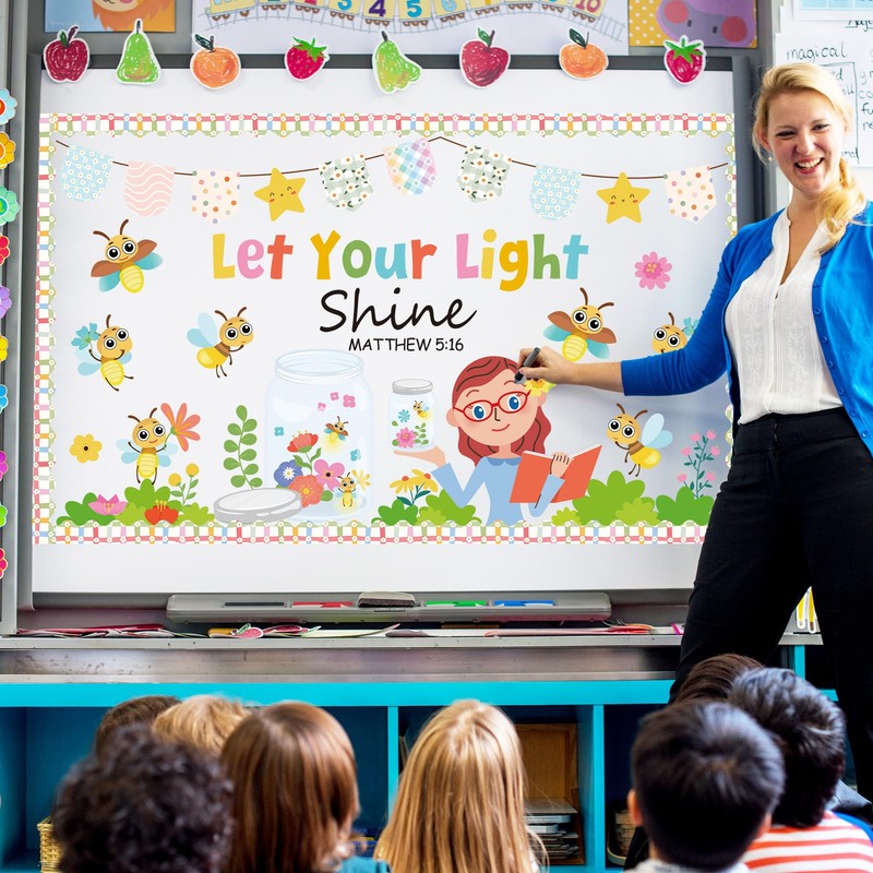 Bring faith and positivity into your classroom with this inspirational “Let Your Light Shine” bulletin board set. Featuring the Bible verse Matthew 5:16, this 40-piece Christian classroom decor collection includes stars, light bulbs, and other faith-themed elements that help motivate students and brighten any learning space.