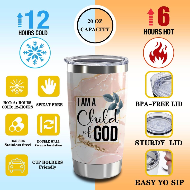 Christian Cross Gift Religious Gift I Am A Child God 20oz Tumbler with Lid and Straw Stainless Steel Insulated Tumbler Scripture Gift (Pink-Child of God)
