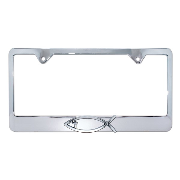 Christian Fish license plate frame by Elektroplate. All-metal (NOT plastic) heavy duty shiny chrome license plate frame with a shiny 3D chrome emblem adhered. All Elektroplate license plate frames are comprised of an all-metal frame with a shiny chrome finish made to withstand harsh outdoor conditions. This Christian Fish license plate frame will look brand new for years to come (as opposed to cheap imitations that will fade or chip within months of being on your vehicle). Our high-end license plate frames are the perfect way to showcase your Religious pride everywhere you drive. In addition, all Elektroplate products are packaged in elegant retail packaging to make a great gift! FREE shipping on all orders.