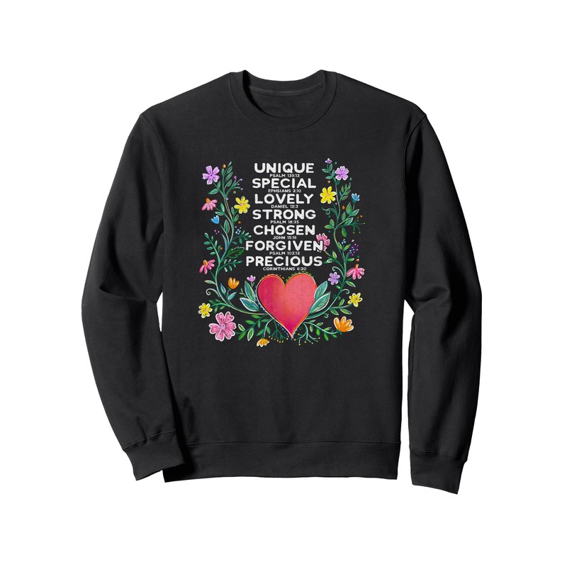 - Inspirational Christian shirt with colorful floral artwork and a heart design. Features uplifting words and scripture references: Unique, Special, Lovely, Strong, Chosen, Forgiven, Precious. Beautiful hand-drawn floral frame and heart graphic.