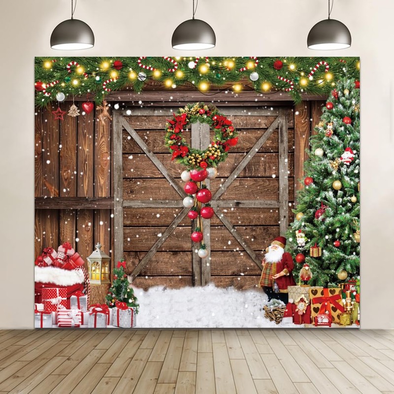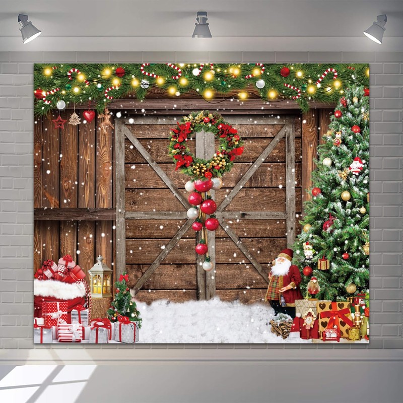 Christmas Backdrops for Photoshoot 10x8ft Vinyl Barn Wood Door Xmas Tree Gift Box Christmas Photography Backdrop Snowy Snowflake Xmas Wreath Xmas New Year Party Decorations Background Photo Booth