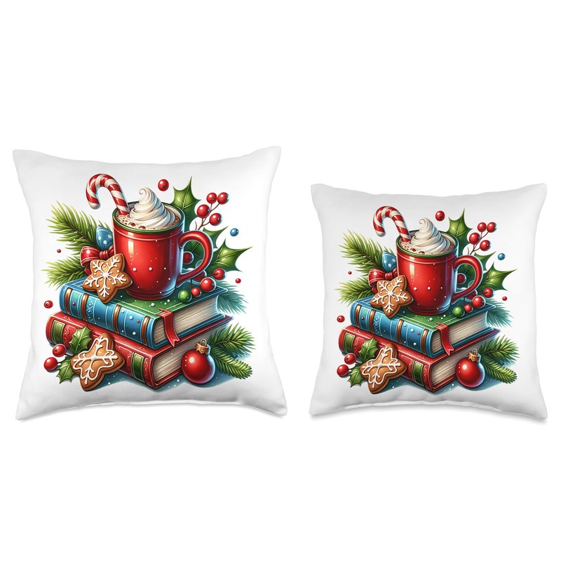- Cozy up with this warm holiday design featuring a festive mug of cocoa and cookies, surrounded by holly and books. Perfect for winter enthusiasts and book lovers enjoying a relaxing evening by the fireplace.