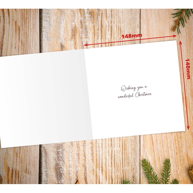 - CHRISTMAS CARD - 148 x 148mm when folded. Card supplied folded and individually wrapped with gold envelope.