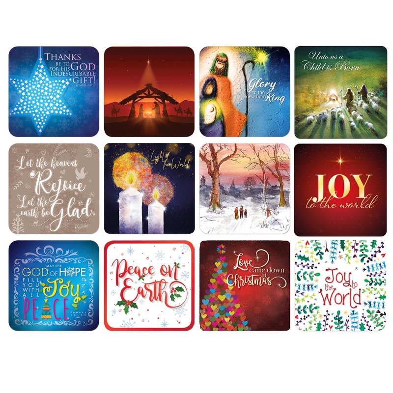 Christmas Coasters, Pack of 12 cork coasters, each of a different design, with inspirational words. Beautiful Chirstmas gifts for women or men, by Just Cards Direct (C223)