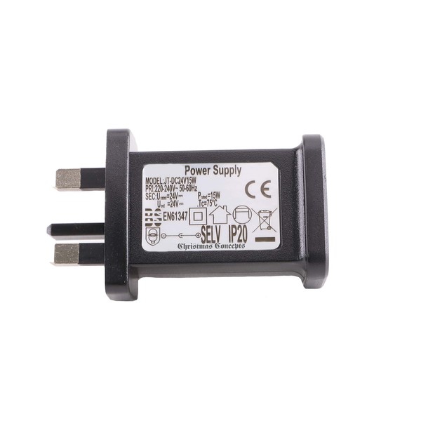 Keep your favourite Christmas lights shining brighter for longer with our replacement UK adaptors. This listing is for 1 x 3 pin UK power adaptor ONLY - No Lead. YOU MUST ONLY PURCHASE THE ADAPTOR THAT MATCHES THE EXACT VOLTAGE AND WATTAGE FOR YOUR ITEM. PRI: 220-240V~50-60Hz. SEC: Urated: 24V, Uout: 24v, Prated: 15W, Tc 75°. Designed and Manufactured Exclusively for Christmas Concepts LTD.