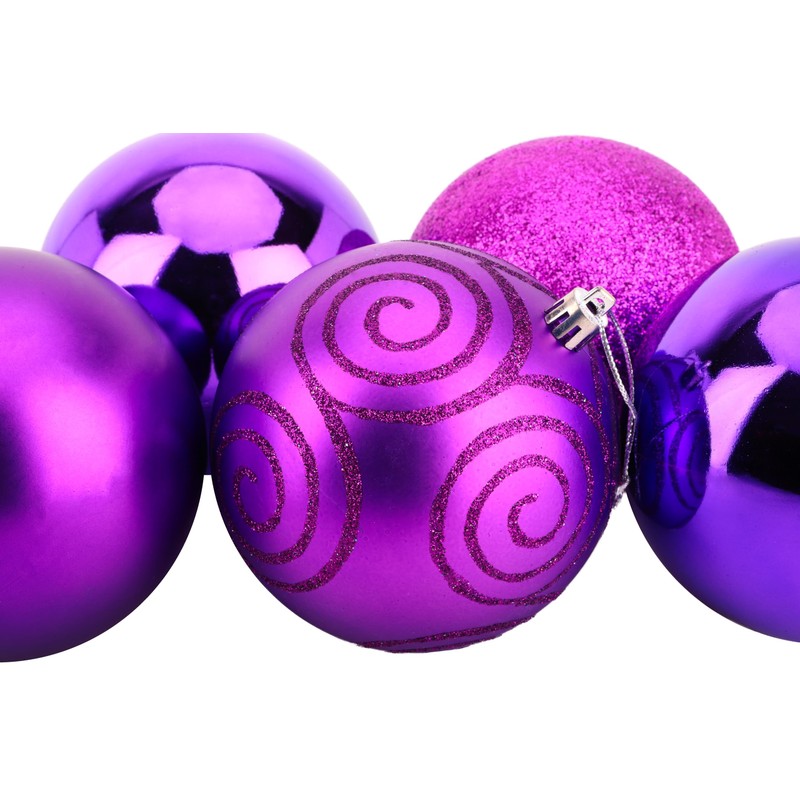 - This pack contains 5 purple baubles in total, including an assortment of glitter, matte, shiny and glitter swirl designs.