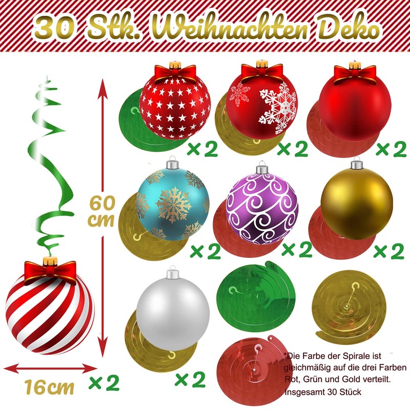 - Box contents: Christmas decorative items include: 30 x hanging decorations (14 pieces hanging swirl decoration, 16 pieces decorative spirals with Christmas tree baubles pattern made of durable paper)