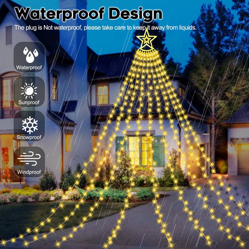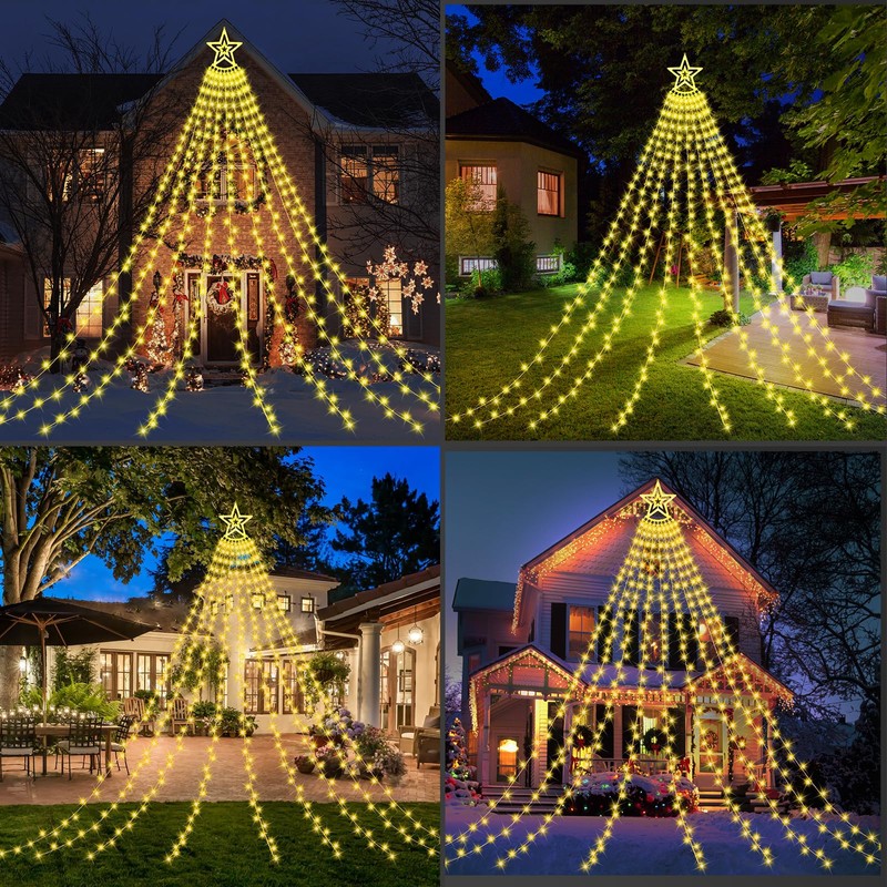 - 【Upgraded Outdoor Christmas Decoration Lights】Feature with 350 bright LED and 1 star topper ornament with 9 strand string lights. Each string light length:11.5ft. The 16.4 ft lead cable and 10 ground spikes make them perfect for stable outdoor displays, lighting up your home or backyard with holiday cheer.