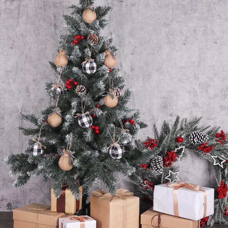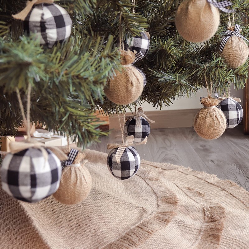 Christmas Decorations Tree Ornaments, 12pcs Buffalo Plaid Burlap Farmhouse Christmas Ornaments, Black White Country Xmas Decor Indoor, Cute Rustic Xmas Balls for Home Office Family Holiday Party