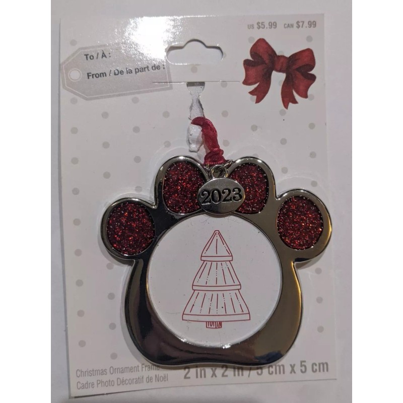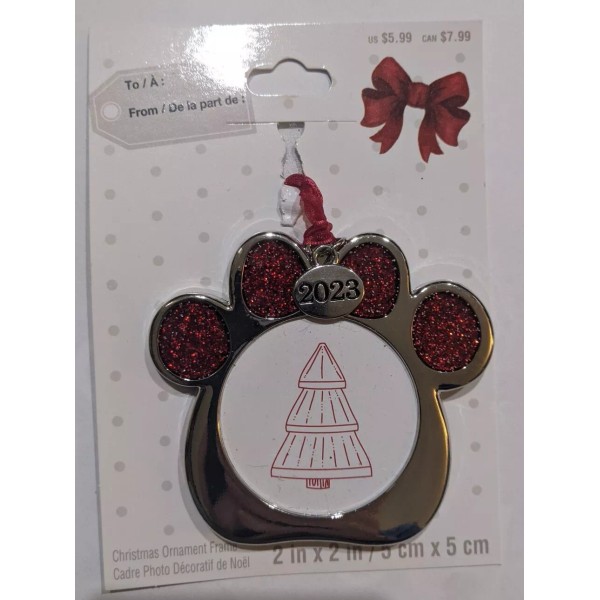 Christmas Dog Paw Silver/Red Photo Holder Ornament New 2" X 2"
