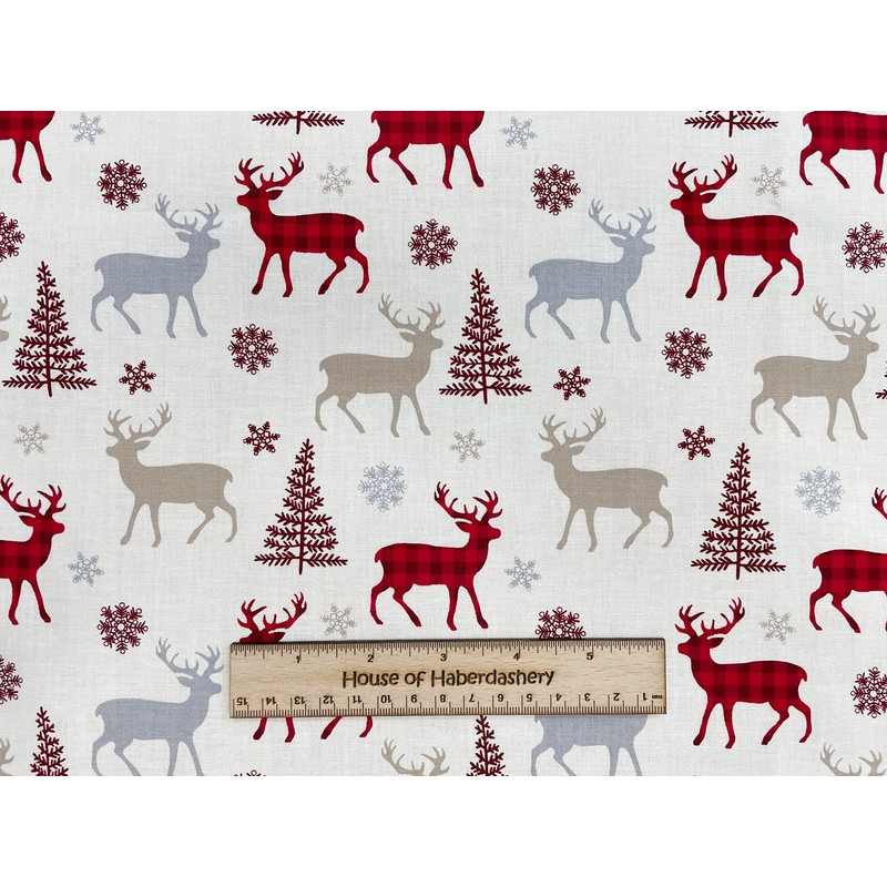 Christmas Fabric Red & Beige Reindeer Design - Cream Background 100% Cotton 53" Wide