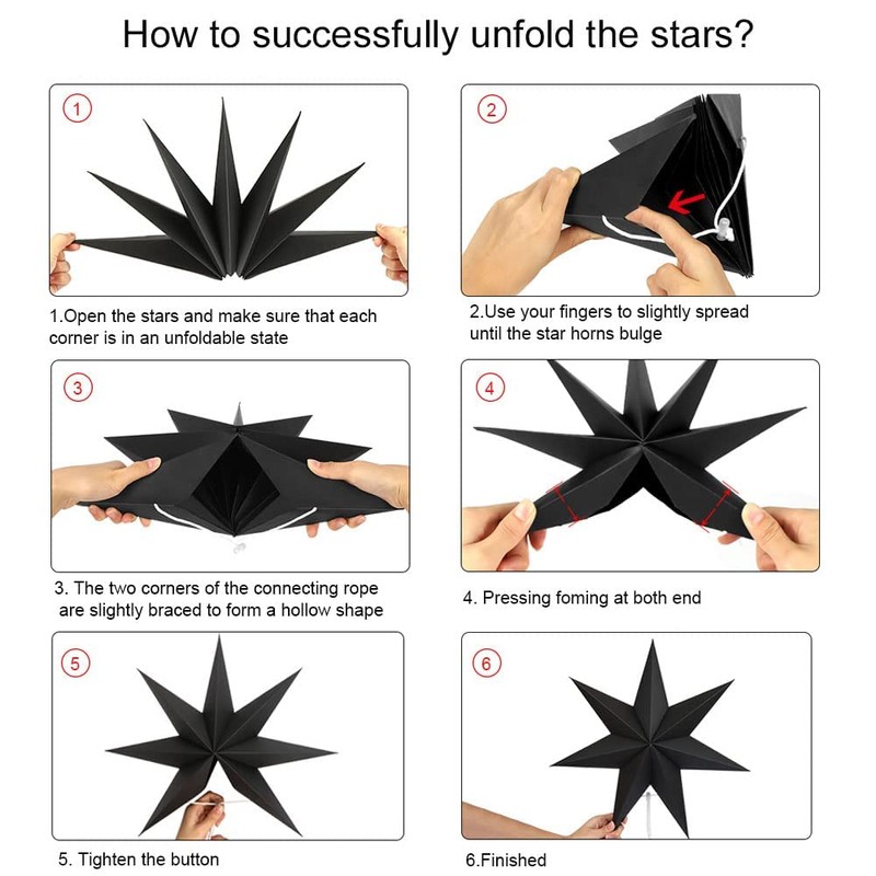 - ★ Easy to open and hang anywhere. Just open the star, adjust the overall shape of the star, turn the knob and tighten the solid line, and the star can be hung.