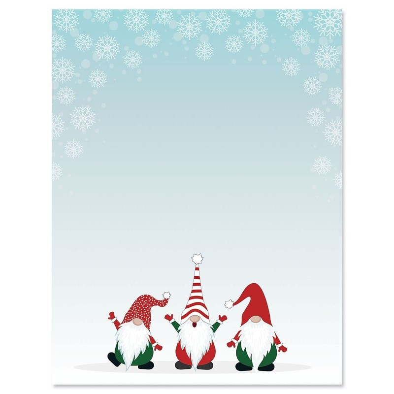Christmas is the perfect time to reach out to family, friends, and loved ones, no matter where they may be. Our vibrant, full-color Christmas-themed letter paper gives you all the convenience of a homemade card without sacrificing any of the cheer. Every page of our stationary set includes a rich, vibrant, edge-to-edge design featuring a festive scene with jolly red, white, and green gnomes and a snowflake background. While the full page features gentle pastel coloration, the border yields a blank space for a hand-written or printed note.