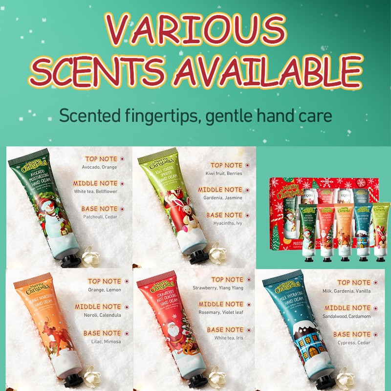 - Christmas Hand Cream Set (5 Pieces) - Five Distinctive Scents: This christmas hand cream set includes avocado, kiwi, strawberry, orange, and milk fragrances. You can choose based on your mood.