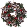 - Traditional festive wreath featuring pinecones and berries, lightly dusted with a subtle white, snow-like frosting