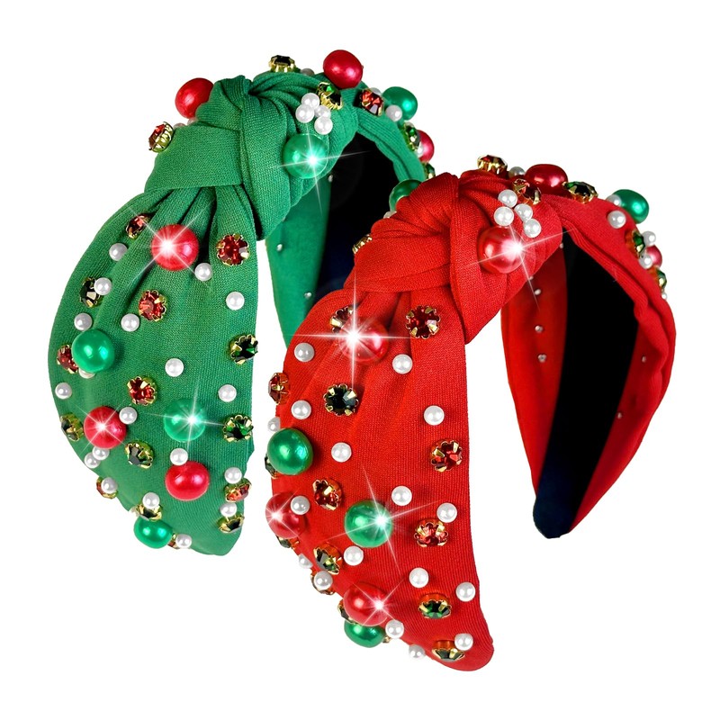 - Package Includes: This set comes with 2 top knotted headbands designed with Christmas elements, features classic red and green colors. The vintage tie headband is made of soft fabric, artificial pearls and rhinestone bead embellishments, and a knot to top it off. These holiday headbands can be paired with various outfits and hairstyles, adding a festive atmosphere and personalized style