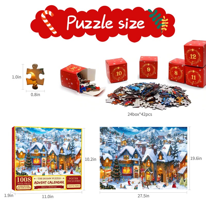 - 【Festive Advent Calendar】This 1008-piece jigsaw puzzle doubles as a unique advent calendar with 42 puzzle pieces hidden behind 24 numbered boxes for a fun countdown to Christmas.