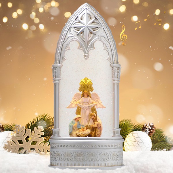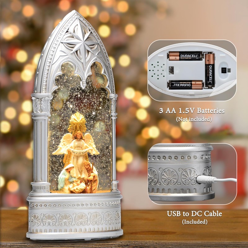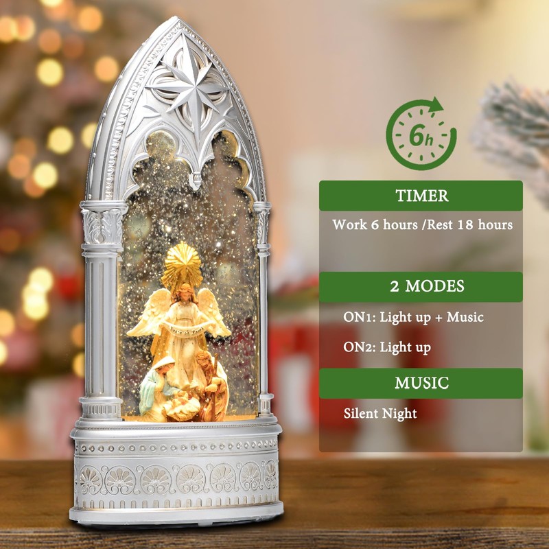- 【Nativity Snow Globe】 Nativity scene snow globe Christmas lantern, Mary and Joseph looking adoringly at Baby Jesus. Inside glitters swirl continuously when you turn on the lantern. Silent Night will play on a loop.