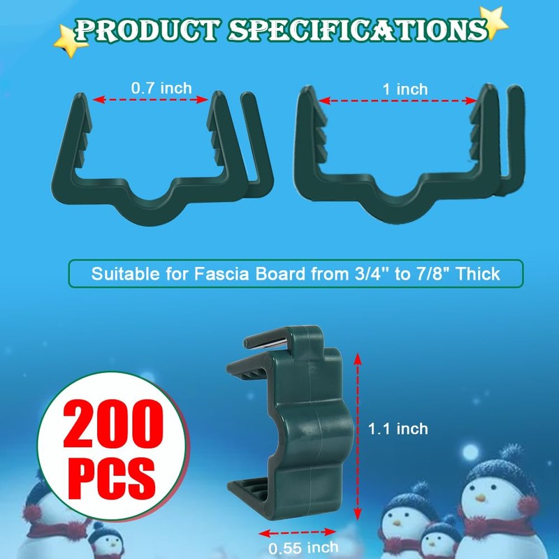 - 【Practical Design】With well-designed shape, holiday light hanger clips can easily clamp on the eaves and firmly fix your string lights. The green color is not abrupt when used with the holiday decorative lights. The size of Christmas clips for lights is 1.1” wide, suitable for 3/4” to 7/8” thick eaves. Please make sure the thickness of eaves before purchasing.