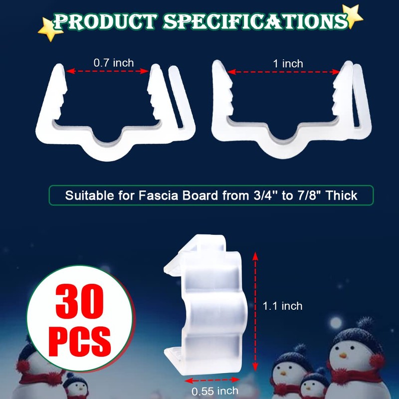 Christmas Light Hangers Clips 7/8 inch Fascia Board Clips Hooks Deck Light Clips Holiday Light Clip for Indoor Outdoor Christmas Decoration Roof Gutter Fence in Thickness from 3/4'' to 7/8" (30PCS)