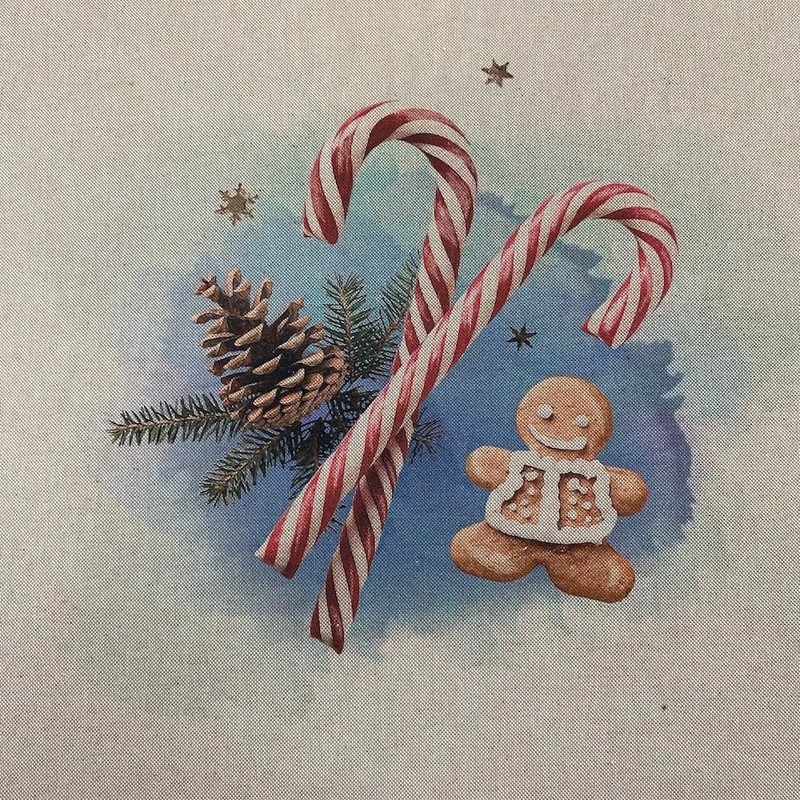 Christmas Linen Look Digital Print Fabric Panel 18" Square 45cm - Per Panel (Gingerbread Man and Candy Cane)